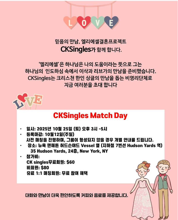 뉴욕에 살면서 '결혼 상대를 어떻게 찾아야 하지?'라는 고민하는 분들이 많으시더라고요. 미국에 살다 보면 소개팅은커녕, 신앙 있는 사람과 건강한 관계를 맺을 기회조차 없잖아요. 그런데 정말 우연히 알게 된 곳이 있어요. 바로 CKsingles.org. 이곳은 단순한 만남이 아닌, 믿음과 가치관이 중심이 되는 믿음가는 결혼 준비 플랫폼이더라고요. 특히 이번 10월 25일 (토요일) 뉴욕 맨해튼에서 열리는 'CKsingles 만남의 날 행사'는 결혼에 고민 중인 분들에게 딱 맞는 기회라 소개하고 싶어 이렇게 글을 씁니다.