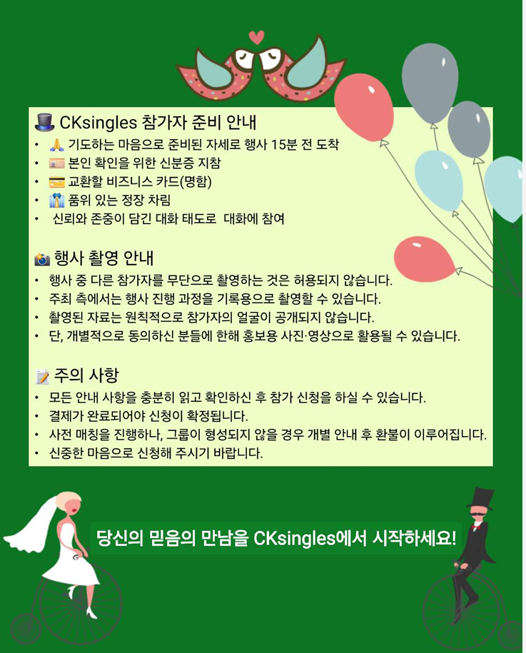 CKsingles는 신앙 중심 결혼을 지향하기 때문에, 기독교 신앙을 가진 분들을 중심으로 모집합니다.