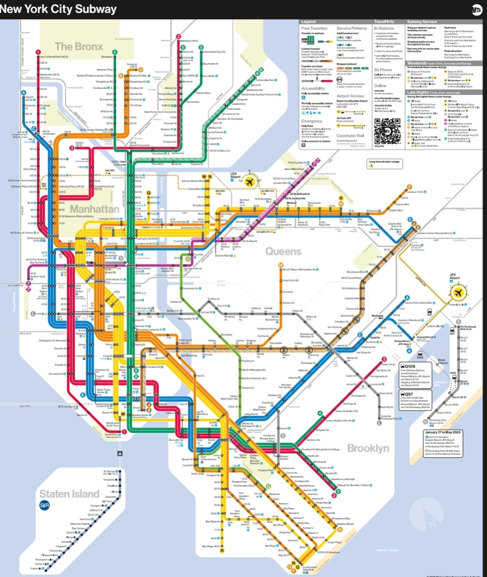 현재는 지리적 위치와 함께 노선도도 보여주는 하이브리드 형식으로 개선되었고, 뉴욕 MTA 공식 앱 "MYmta"나, 실시간 열차 위치와 알림을 받을 수 있는 "Transit" 앱을 이용하면 훨씬 편해요.